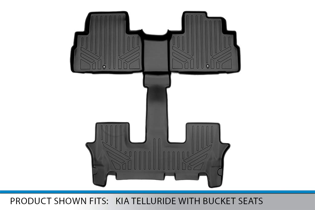 SMARTLINER All Weather Custom Fit Black 3 Row Floor Mat Liner Set - 120 Compatible with 2020-2023 Kia. Smartliner All Weather 3 Row Floor Mat Set. SMARTLINER Custom Fit for 2020-2023 Kia Telluride with 2nd Row Bucket Seat No Center Console with in between Coverage Perfect fit modern style and durability all backed by.